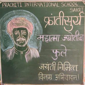 धुळे जिल्ह्यातील प्रचिती इंटरनॅशनल स्कूलमध्ये समाजसुधारक महात्मा जोतिबा फुले यांची जयंती मोठ्या उत्साहात आणि आदरपूर्वक साजरी करण्यात आली. या कार्यक्रमाच्या निमित्ताने विद्यार्थ्यांमध्ये सामाजिक जाणीव, समानता आणि शिक्षणाचे महत्त्व रुजविण्याचा प्रयत्न करण्यात आला.