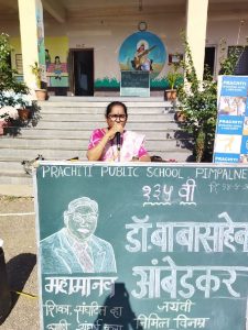 शाळेचे शिक्षक अभिषेक माेरे सर यांनी आपल्या भाषणातून डाॅ. बाबासाहेब आंबेडकरांच्या जीवन कार्याविषयी माहिती दिली. तसेच समन्वयक राहुल अहिरे सर यांनी डाॅ. बाबासाहेब आंबेडकर यांनी हालाखीच्या परिस्थितीतही स्वतःच्या शिक्षणाकडे लक्ष देऊन वेगवेगळ्या पदव्या प्राप्त करून आपल्या ज्ञानदानाने समाजाला प्रेरित केले हे स्पष्ट केले. शाळेच्या मुख्याध्यापिका अनिता पाटील मॅडम यांनी त्यांना संविधानाचे जनक म्हणून संबाेधले जाते. हे सांगून विद्यार्थ्यांना डाॅ. बाबासाहेब आंबेडकरांच्या शैक्षणिक व सामाजिक जीवनाची माहिती दिली.