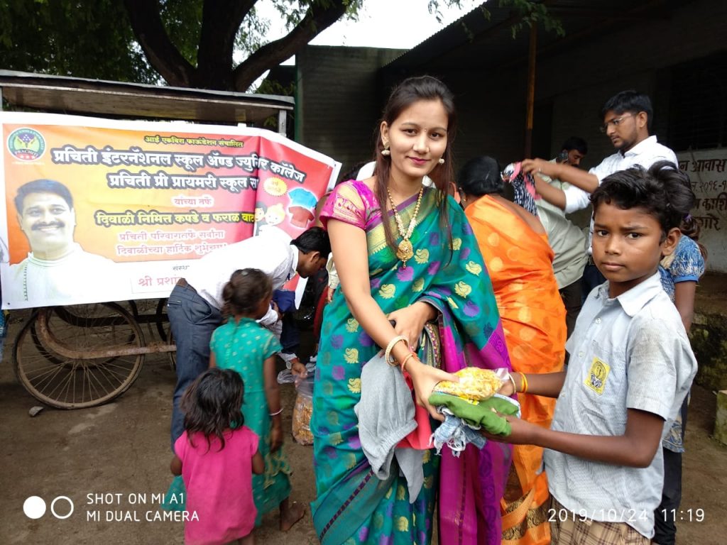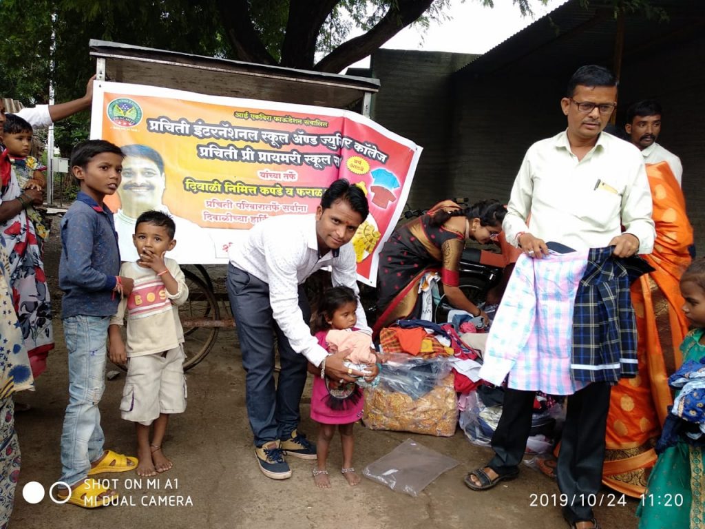 साक्री – येथील प्रचिती इंटरनॅशनल स्कूल व जूनियर कॉलेज तर्फे दिपावली सण उत्साहात साजरा करण्यात आला. केंद्रीय माध्यमिक शिक्षा बोर्डच्या निर्देशित केलेल्या अभ्यासक्रमानुसार विद्यार्थ्यांमध्ये विविध जीवन-कौशल्य विकसित व्हावे, म्हणून दैनंदिन जीवनात असलेल्या विविध सणांचे महत्व पटवून देतांना दीपावली हा सण पार पडला. या कार्यक्रमानिमीत्त आर्थिक दुर्बल घटकातील मुला-मुलींना सणाचे औचित्य साधून संस्थेचे चेअरमन प्रशांत पाटील यांच्या मार्फत कपडे व फराळ वाटप करण्यात आले.