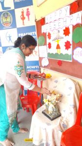 चौफेर न्यूज – प्रचिती इंटरनॅशनल स्कूल मध्ये नवरात्रीनिमित्त कार्यक्रमाचे आयोजन करण्यात आले. याप्रसंगी विद्येची देवता सरस्वती मातेच्या प्रतिमेचे पूजन शाळेच्या प्राचार्या सौ. भारती पंजाबी,, मॅडम, सौ वैशाली लाडे मॅडम ,व्यवस्थापक श्री. वैभव सोनवणे सर श्री. तुषार देवरे सर यांच्या हस्ते करण्यात आले. याप्रसंगी इयत्ता नववीच्या नेहा पाटील या विद्यार्थिनीने देवीच्या नव रूपांची माहिती देताना सांगितले की शारदीय नवरात्र हा देवी दुर्गा मातेच्या स्मरणार्थ साजरा केला जाणारा एक हिंदू सण होय . नवरात्र म्हणजे नवरात्रीचा समूह दुर्गादेवीची उग्र व सौम्य अशी दोन रूपे आपणास पाहायला मिळतात. उमा, पार्वती, जगदंबा भवानी ही देवीची सौम्य रुपे आहेत़. दुर्गा चंडी, चामुंडा ही देवीची उग्ररूपे आहेत .प्रथम शैलपुत्री , द्वितीय ब्रह्म चारिणी, तृतीय चंद्र घंटा, चतुर्थ कृष्ण मांडा ,पंचम स्कंदमाता, षष्ठम कात्यायनी, सप्तम काल रात्री, अष्टम महागौरी ,नवम सिद्धी रात्री अशी देवीची नऊ रूपे आहेत .नवरात्रीच्या पहिल्या माळेला म्हणजेच पहिल्या दिवशी पांढरा रंगाचे वस्त्र परिधान केले जातात. दुर्गा देवीचे प्रथम रूप म्हणजे शेलपुत्री आहे .शैलपुत्री पर्वतराज हिमालयाची कन्या आहे. देवीची पूजा पांढऱ्या रंगाच्या फुलांनी केली जाते पांढऱ्या रंगाचे वस्त्र अर्पण करणे शुभ मानले जाते. शैल म्हणजे पाषाण आणि पाषाणाप्रमाणे ठाम प्रेरणा यातून मिळते . देवीचे द्वितीय स्वरूप म्हणजे ब्रह्मचारिणी या देवीच्या पूजनाने सुख ,शांतता ,समृद्धता आणि धर्म प्राप्त होते .या दिवशी लाल रंगाचे वस्त्र परिधान केले जातात .दुर्गा देवीचे तिसरे रूप चंद्रघंटा आहे .चंद्र घंटा देवीने ललाटावर चंद्र धारण केला आहे. भूतलावर धर्माचे रक्षण करण्यासाठी देवीचा अवतार झाला होता .या दिवशी निळ्या रंगाचे वर्ष परिधान केले जातात. दुर्गा देवीचे चौथे रूप कुशमांडा आहे. ब्रम्हांडाची निर्मिती केल्यामुळे या रूपाला कुशमांडा असे संबोधले जाते. या देवीची उपासना मनुष्याला रोगापासून दूर करते अशी मान्यता आहे .या देवीला पिवळा रंग प्रिय आहे.. म्हणून या दिवशी पिवळ्या रंगाची वस्त्र धारण केली जातात. दुर्गा देवीचे पाचवे रूप म्हणजे स्कंदमाता आहे. कार्तिके म्हणजे भगवान शंकर व माता-पार्वती यांचे पुत्र होय . स्कंद मातेचे व्रत मुलांना दीर्घायुष्य देण्यासाठी केले जाते .देवीला हिरवा रंग प्रिय आहे. देवीचे सहावे रूप म्हणजे कात्यायनी आहे . या देवीच्या पूजनाने धर्म अर्थ काम आणि मोक्षाची प्राप्ती होते .. देवीचा अवतार धारण करण्यामागील मुख्य उद्देश धर्माची पुनर स्थापना संरक्षण असल्याचे म्हटले जाते. देवीला भुरारंग प्रिय आहे . देवीचे सातवे रूप काल रात्री आहे . काल रात्रीचे रूप भ